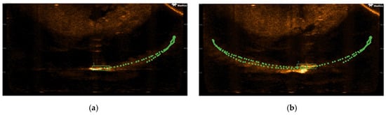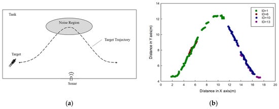 In Figure 32a, the relative trajectories of the two targets illustrated are approximately parallel, with a significant reverberation region evident in the latter portion of the trajectory. Figure 32b–d indicate that as the targets pass through the reverberation zone, the tracking stability of the three methodologies experiences varying degrees of decline. This decline is characterized by interruptions in the trajectory, which can be attributed to the reverberation noise’s intensity approaching or exceeding the imaging intensity of the targets. Such conditions complicate the differentiation of target image features and may even result in complete obscuration by the noise. The SORT method is particularly prone to generating numerous identity alterations throughout the tracking process, leading to considerable instability. In contrast, the traditional DeepSORT method encounters similar difficulties, as demonstrated by the tire target’s identity changing while traversing the reverberation zone, followed by multiple identity changes in subsequent tracking phases. Conversely, the ExDeepSORT method has the ability to recover identity after passing through the reverberation zone, thereby maintaining a continuous and stable tracking process thereafter. The tracking results of the ExDeepSORT method applied to actual underwater sonar image sequences are presented in Figure 33.