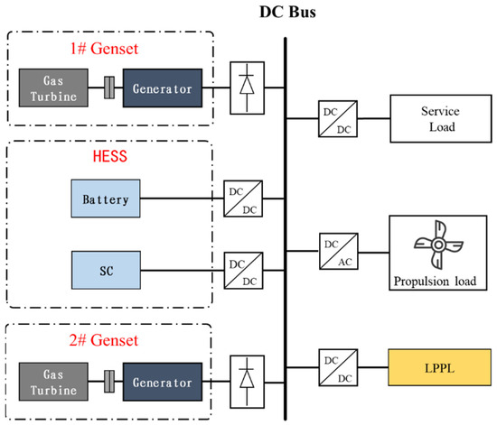 Figure 1 depicts a conceptual topology of the MVDC system, which mainly consists of two gas turbine gensets, a grid-connected HESS composed of batteries and supercapacitors (SCs), propulsion load, LPPL, and service load [35]. The various grid-connected components are integrated into the DC bus through converters, facilitating an orderly power flow and coordinated operation controlled by a hierarchical control system. While this structure simplifies certain details compared to the actual system, it sufficiently represents the energy coupling dynamics and optimization method. Therefore, this paper primarily discusses and analyzes the system based on this structure.