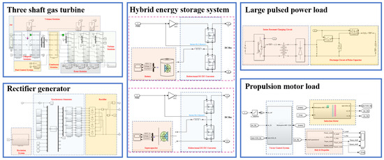 To effectively predict and analyze the dynamic response of the system during LPPL operation and to optimize the system design, we developed simulation models for the three-shaft gas turbine, rectifier generator, HESS, propulsion load, and LPPL, as shown in Figure 2.