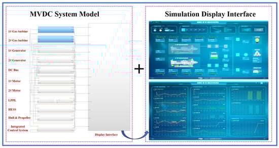 The electromagnetic and electromechanical transients of the ship’s MVDC system are closely coupled and exhibit multi-time-scale characteristics. Different modules have varying research focuses and simulation step size requirements, so using a uniform step size may lead to longer computation times or failure to converge [36]. To enable an integrated simulation of the system model, we adopted a model partitioning approach, dividing the system into 12 submodules. Each subsystem operates independently, while adjacent subsystems exchange coupling signals. This approach allows for model decoupling and matrix order reduction in large-scale, multi-node systems, saving disk storage on the simulation machine and reducing overall computation time, thereby enabling real-time simulation. The simulation step size for each module is primarily determined based on the model’s scale and hardware performance, ensuring that each module meets the real-time requirements on the existing CPU. Based on this, we ultimately set the simulation step sizes for each module as follows: the three-shaft gas turbine and propeller modules have a step size of 10 milliseconds; the generator, propulsion motor, energy storage device, and other modules have a step size of 50 microseconds; and the high-energy pulse load module has a step size of 380 nanoseconds. We developed the system’s real-time simulation model on the RT-LAB simulation platform, incorporating parallel computing and FPGA technology, which enables real-time simulation of the system model and provides an effective tool for subsequent optimization. The system model interface is shown in Figure 3, with the left side displaying the system model interface and the right side showing the display interface we developed.