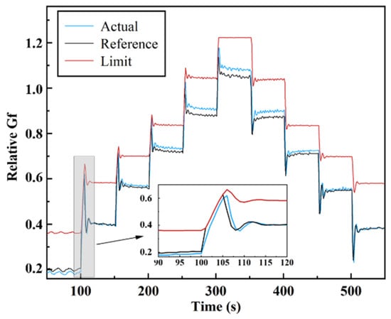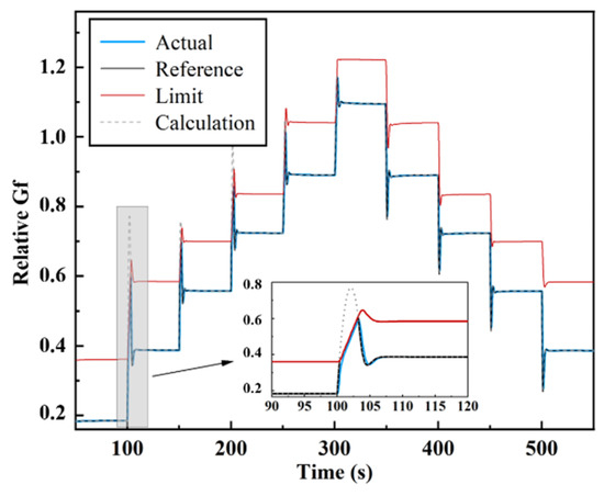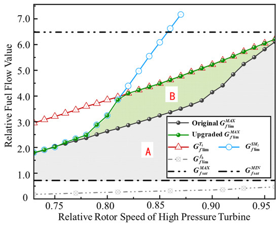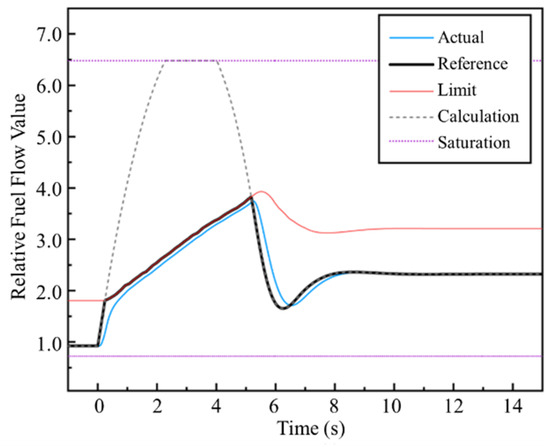 In general, the dynamic performance of a system is mainly determined by the controller and the controlled object’s characteristics. In terms of controller optimization design, simulation and experimental results clearly show that when there is a load fluctuation, the actual fuel flow of the gas turbine is constrained by the fuel limit line, and simply relying on control algorithm improvements is difficult to achieve the desired effect. This conclusion can be observed in Figure 9, which presents an example showing the variation curves of key parameters of the fuel system during a sudden load increase from no load to 20% of the rated load. Therefore, based on the fast prediction method of the gas turbine dynamic performance, we designed an improved fuel dynamic limit and expanded the fuel safety region, as shown in Figure 10 [33].