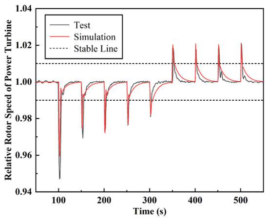 Figure 5 and Figure 6 present the simulation and test curves of the main fuel system parameters. It can be seen that the simulation results accurately reflect the gas turbine fuel variations. With the high dynamic simulation accuracy of the fuel control system, power turbine speed also features high dynamic accuracy, as shown in Figure 7. Comparing the simulation and the test, TSR errors for typical design transient conditions are within 1% and stability time errors are all within 1 s, which are essential foundation for the model to be used for gas turbine dynamic performance analysis.