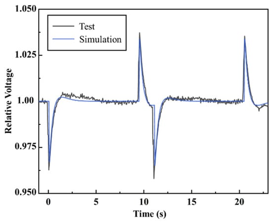 To verify the voltage simulation accuracy, we designed Test Condition 2: adjusting the resistive load to simulate the operational characteristics of a high-energy pulse load, operating for two cycles, with a single-cycle connection time of 9.5 s, a total cycle time of 11 s, and a peak relative power of 0.16. The bus voltage transient fluctuations under this condition were compared between the experimental and simulation results, as shown in Figure 8. The results indicate that the simulation system can accurately predict the voltage transient fluctuations caused by load changes.