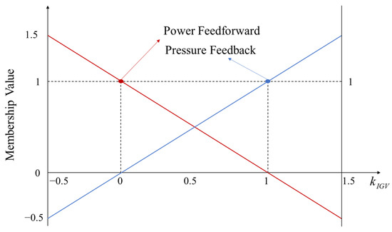 where and represent the IGV angles corresponding to the “pressure feedback” and “power feedforward” strategies, respectively; and represent the membership degrees of the two strategies. To maintain the consistency of the IGV angle with the steady-state operating conditions of the gas turbine, Equation (2) must be satisfied. By introducing IGV adjustment parameter , the IGV angle of the gas turbine is dynamically controlled. The relationship between the membership degree and is shown in Figure 11.