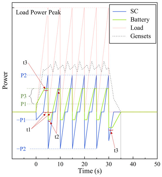 where , , , represent the power–time curve functions for the load, parallel gensets, supercapacitor, and battery during the triangular LPPL operation.