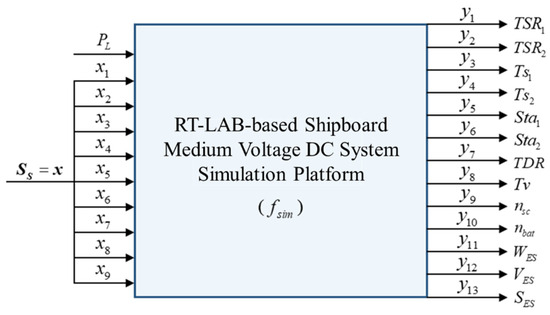 where consists of 9 elements, corresponding to , consists of 13 elements, representing the following: the transient speed regulation rate corresponding to the first and second speed transient fluctuations ( and ), the stable time corresponding to the first and second speed transient fluctuations ( and ), the accumulated value of speed deviation (), the accumulated value of speed overshoot beyond the stable boundary (), the voltage transient deviation rate (), the voltage stable time (), the required number of supercapacitor modules (), the required number of battery cells (), the weight, volume, and spend requirements of the HESS (, and ). is the nonlinear mapping relationship from to , which can be computed using the MVDC system simulation platform, as shown in Figure 15. and are calculated according to Equations (18) and (19), where is the function of the unit speed with respect to time, is the speed difference beyond the stable boundary.