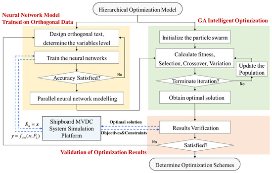 In the hierarchical optimization model, the objective function and the decision variables exhibit highly nonlinear characteristics with respect to , and involve system simulation computations. Mathematical solutions based on analytical methods are difficult to implement effectively, and directly using intelligent optimization algorithms to search for the optimal solution would be time-consuming. Therefore, this paper proposes a solution method based on a genetic algorithm, which employs orthogonal experiment training and a parallel neural network model, as illustrated in the process depicted in Figure 16.