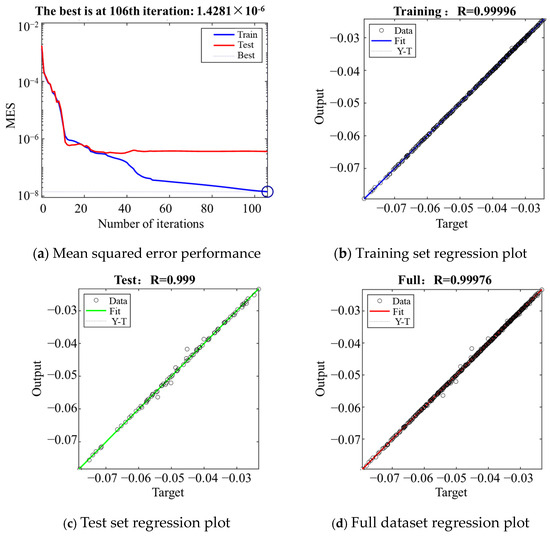 - Based on empirical formulas and data characteristics, the neural network parameters are reasonably designed, and each output is validated individually. For example, for , the number of hidden layer nodes is set to 15, the learning rate is set to 0.01, the maximum number of iterations is 200, and the data are divided into 80% training set and 20% test set. Mean squared error (MSE) and regression R-value are used as evaluation metrics, with results shown in Table 2 and Figure 18, indicating that the BPNN1 neural network has a high prediction accuracy.