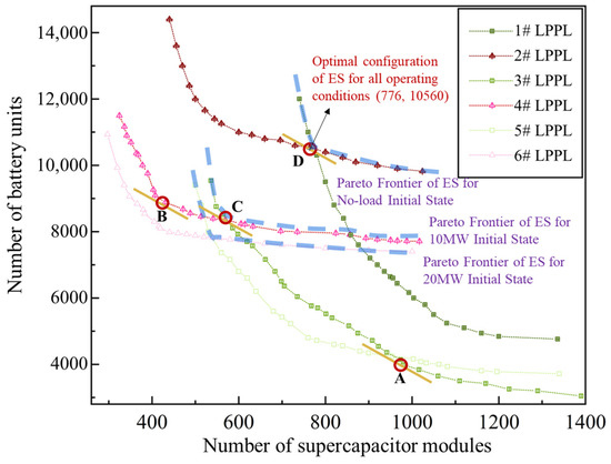 - The application of this method in typical operating scenarios demonstrates that the optimal energy storage configuration consists of 776 supercapacitors and 10,560 batteries, with a total weight of 21,036 kg, a volume of 57.26 m3, and a cost of CNY 34.06 million. The system’s dynamic performance also shows significant improvement. In Scenario 1, the system’s optimal dynamic performance indicators are as follows: transient speed regulation of 4.0%, stable time of 8.6 s, and bus voltage transient deviation rate of 0.9%. In Scenario 2, the system’s optimal dynamic performance is: transient speed regulation of 4.5%, stable time of 6.4 s, and bus voltage transient deviation rate of 1.1%.