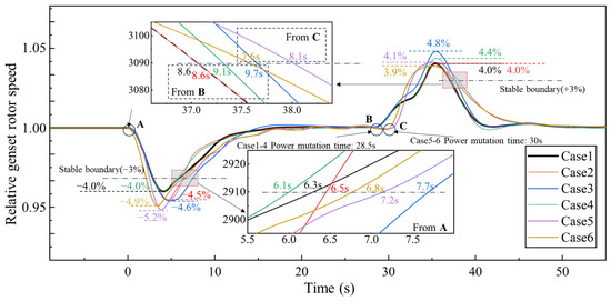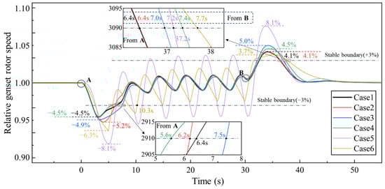 Speed curves of the gensets in Scenario 2 for Cases 1–6.