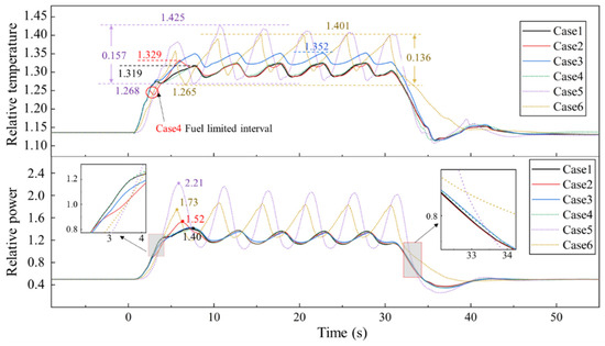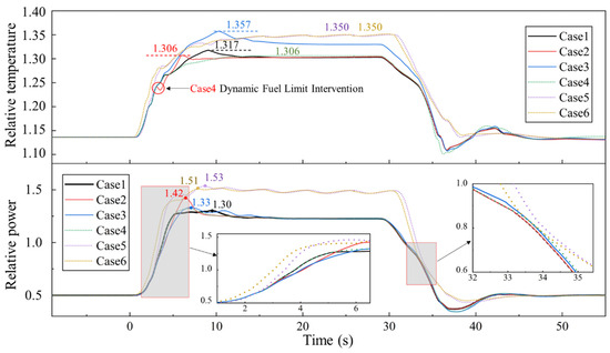 High-pressure turbine inlet relative temperature and power turbine output power curves of the gensets in Scenario 2 for Cases 1–6.