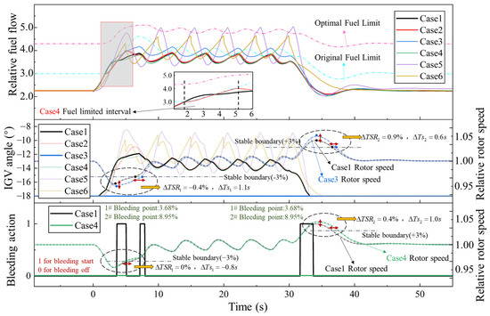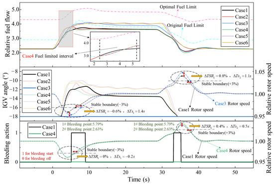 Figure 29 illustrates the impact of the gas turbine optimization strategy on dynamic performance. In Case 2, fuel flow is restricted between 2.5 and 5.5 s, limiting the gas turbine power response. In contrast, Case 1 adopts an improved fuel limit strategy that expands the safe fuel flow range, enhancing power response during surges while ensuring safe operation. Comparing Case 1 and Case 3 reveals the effect of IGV dynamic regulation on transient speed fluctuations. Without IGV adjustments, speed fluctuations are more pronounced: increases by 0.6%, and is extended by 1.4 s; increases by 0.8%, and is extended by 1.1 s. Comparing Case 1 with Case 4 highlights the effect of the bleed strategy. In Case 4, the absence of the bleed strategy results in larger transient speed fluctuations during power decline, with increasing by 0.4% and extended by 0.5 s.