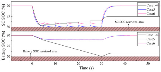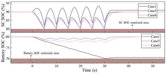 As shown in Figure 30, in Case 1, the battery SOC exhibits significant variation, indicating that the energy density advantage is fully utilized within the power limits. It not only provides effective energy compensation during sudden load changes between 0 and 5 s and 30–37 s, but also continuously supplies energy from approximately 7 to 28 s, effectively reducing the load power surge during LPPL operation.