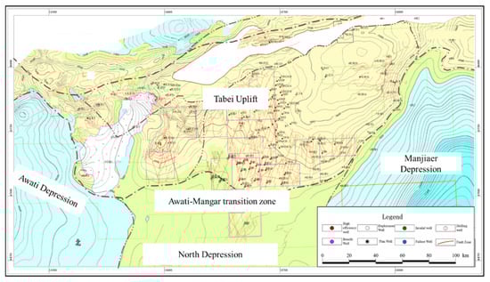 The study area, the Furman Oilfield in the Tarim Basin, is located between the Tabei and Tazhong oil-bearing regions in Xinjiang Uygur Autonomous Region, China. It contains a large Ordovician marine carbonate reservoir, which is part of the Lugu-Tahe-Halahatang-Yingmaili Oilfield (Figure 1). The reservoir space is highly complex, featuring developed strike-slip faults, fault interlayers, and fault zones. The main body of the B5 well area lies within the Aman transition zone, situated between the Awati depression and the Manjiaer depression, forming a generally saddle-shaped structure. The primary target strata are the Ordovician Yijianfang Formation and Yingshan Formation, characterized by fracture-controlled fractured-vuggy marine carbonate reservoirs. These reservoirs exhibit diverse storage spaces, including fractures, fissures, and dissolution-induced cavities and vugs of varying sizes and shapes. The study area’s complex geological conditions result in intricate fluid flow patterns, making the characterization of connectivity between fractures and cavities challenging. Figure 1 provides a detailed structural location of the study area, illustrating the regional tectonic setting and the distribution of key geological features [28].