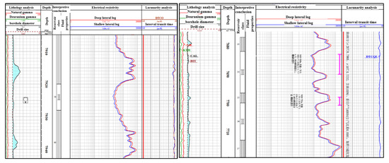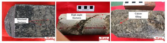 Through core observation and interpretation of imaging logging data, it was found that the study area is developed with long, high-angle fractures. The fracture image logging curves exhibit black sinusoidal shapes, primarily representing structural fractures, which are mostly filled with mud. There are significant differences in the deep and shallow laterolog resistivity, with the gamma value slightly low. The wellbore diameter shows slight enlargement, and the neutron, density, and acoustic curves exhibit minimal variations, close to the matrix values. The study indicates that the primary fractures in the target reservoir interval are structural fractures, followed by dissolution fractures, weathering fractures, and sutures as non-structural fractures. Early fractures were filled with calcite, and later, they underwent fragmentation and brecciation along the fracture zones. The core fracture development characteristics are shown in Figure 5.