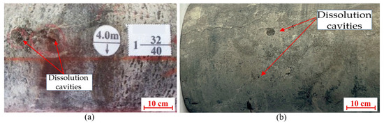 Development characteristics of reservoir core dissolution cavity in the study area (according to the internal data of PetroChina Tarim Oilfield, 2023): (a) Well FA (7410.00 m); (b) Well FB (7411.00 m).
