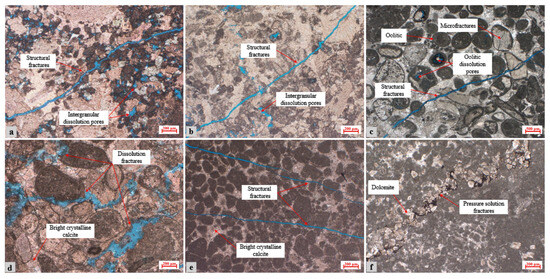 The cast-thin section samples were taken from wells FB, FA, and FB-3, located in the southern, northern, and central parts of the FⅠ17 fault zone in the F well area, respectively. The thin section observations under the microscope indicate that the study area is primarily developed with intergranular dissolution pores, structural fractures, and dissolution fractures (Figure 6). Intergranular dissolution pore refers to the porosity formed by the dissolution of cement or unstable minerals between particles. It is irregularly shaped or almost circular under the flake of the cast body, distributed between the particles, and the boundary is smooth or slightly eroded. Tectonic fractures are rock fractures formed by tectonic stress and are usually related to regional tectonic activities. They are linear or curved under the cast flake, narrow in width, and usually have a straight slit boundary that may penetrate the particle and substrate. Corrosion fracture refers to the further corrosion of underground fluid on the basis of structural fracture or other microfractures, which makes the fracture expand irregularly. The shape of the cast is irregular under the thin section, and the fracture boundary is rough, wavy, or jagged, which is more irregular than the structural fracture.