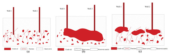 Diagram of inter-well reservoir connectivity modes: (a) rack connectivity; (b) karst connectivity; (c) fractured-vuggy connectivity.
