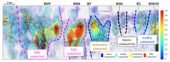 The connectivity intensity (Stotal) of each region within the fractured-vuggy reservoir is classified into four levels: when 0 < Stotal < 0.10, it is classified as micro-connectivity; when 0.1 < Stotal < 0.3, it is weak connectivity; when 0.3 < Stotal < 0.6, it is moderately connected; and when 0.7 < Stotal < 1, it is fully connected. Figure 8 presents the integration of different attributes within the reservoir and the three-dimensional mapping of connectivity intensity, while Figure 9 shows the connectivity probability analysis of key wells in the study area based on attribute fusion. From Figure 8 and Figure 9, it can be observed that the connectivity intensity of the fractured-vuggy bodies near the BH8 and BH9 well areas is the highest, with Stotal > 0.8, indicating complete connectivity between the BH8 and BH9 well areas. The connectivity intensity of the fractured-vuggy bodies near the B5 well area is slightly lower, with 0.3< Stotal < 0.7, indicating moderate connectivity in the vicinity of the B5 well area. The connectivity intensity of the fractured-vuggy bodies near the BH6 well area is the lowest, with most regions having Stotal < 0.1, indicating weak connectivity between the BH6 well area and a micro-connectivity state between wells.