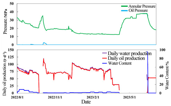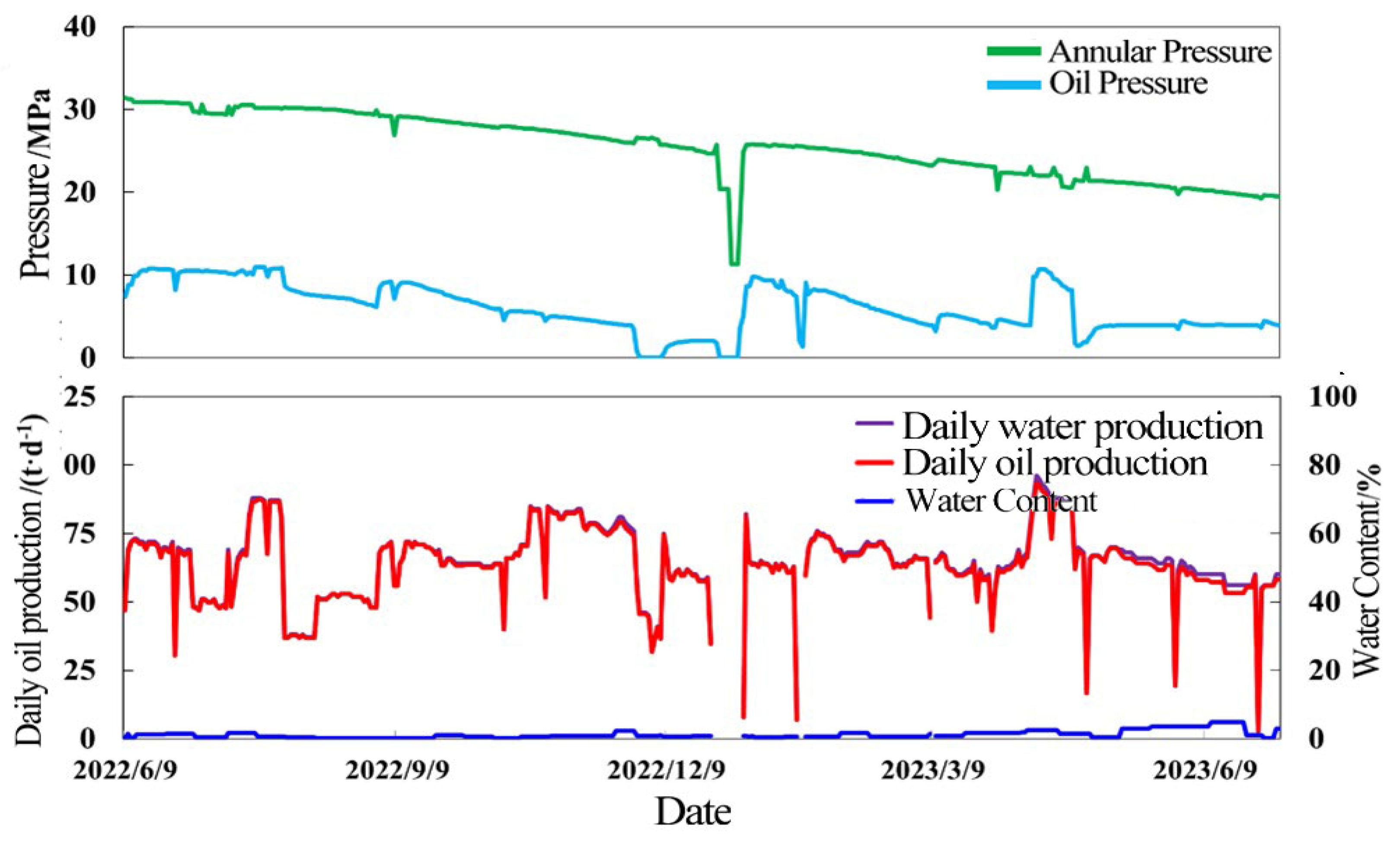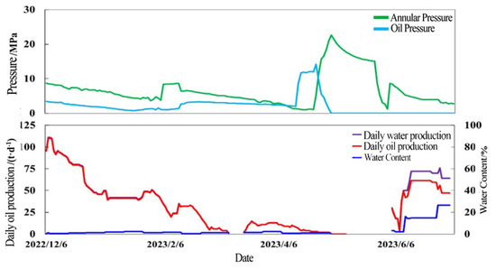 Well B506-H is located in the north–central part of the B5 well area. The well was put into production on 10 October 2022. At the beginning of production, the daily oil production was 10.97 t. Currently, the daily oil production has increased to 47.01 t, with a water content of 26.64%. By 4 July 2023, the cumulative oil production reached 0.6171 × 10⁴ t, with low water content and no violent flooding characteristics (Figure 14).