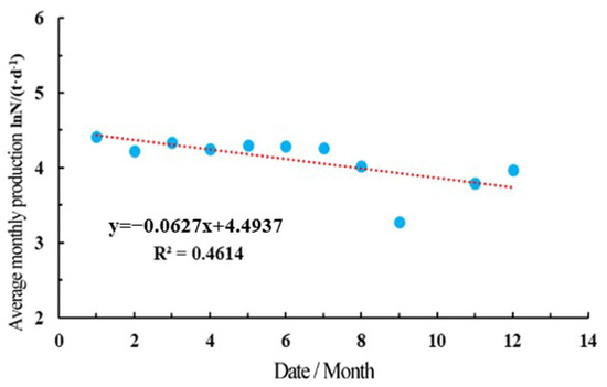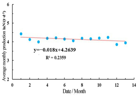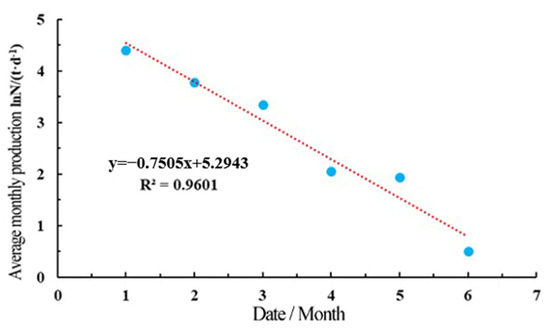 Figure 11 shows the curve of the monthly average daily crude oil production from the B504-H2 well over time (logarithmic coordinate system). The monthly average decline rate of oil production for well B504-H2 is approximately 6.27%, indicating a rapid decline type. This well is classified as a fractured reservoir.