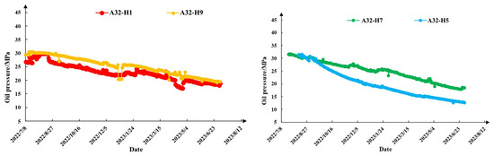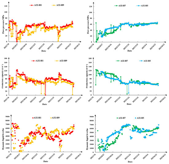 The production dynamic curve can be regarded as a time series of a certain length. The similarity between two time series can be discriminated by calculating their DTW values; the smaller the DTW value, the higher the similarity, indicating a better degree of connectivity between the two wells. Conversely, the larger the DTW value, the worse the connectivity between the wells. Based on the four dynamic indicators of bottom-hole flow pressure, production, oil pressure, and dynamic liquid level, the inter-well similarity analysis is conducted. To visualize the similarity of well development indexes, the dynamic characteristic curves between two wells in the A32 well group are plotted, as shown in Figure 18.