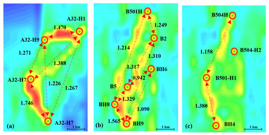 All four wells in the A32 well group are multi-connected, and the schematic diagrams of the well connections in the study area are drawn, as shown in Figure 19. From Figure 19, it can be seen that the reservoir connectivity of B5 well group 2 is different from that of the A32 well group and B5 well group 1, in which B504-H2 has poor connectivity with other wells, reflecting the poor reservoir connectivity around the well.