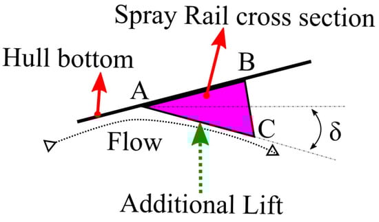 Depiction of spray rail fluid flow, showing how it redirects flow away from the hull while simultaneously generating lift. The spray rail’s cross-sectional characteristics are labeled as A, B, and C. The bottom angle of the spray rail is denoted by δ.
