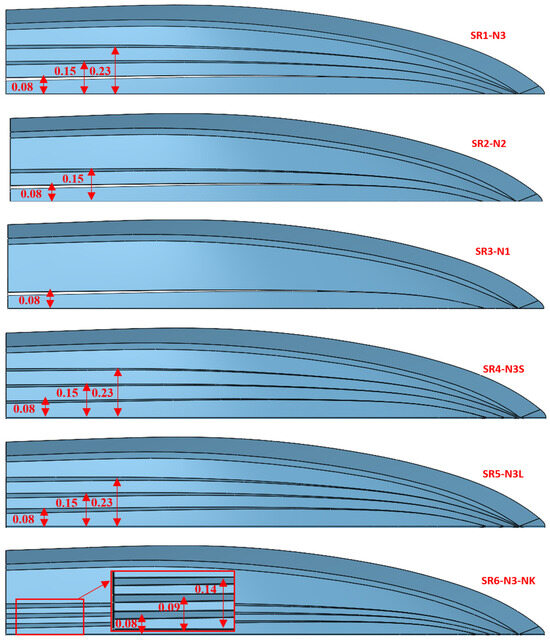 This study evaluates seven distinct SR arrangements, each varying in size, position, and quantity (Table 3). The configurations range from SR1-N3 to SR3-N1, with the number of rails decreasing from six to two. Furthermore, SR4-N3S and SR5-N3L explore the smallest and largest spray rail dimensions, while SR6-N3K and SR7-N3C investigate the effects of positioning the rails closer to the keel and chine, respectively. Full-length spray rails were chosen to maximize the spray deflection, increase lift, and reduce wetted surface area, collectively leading to enhanced hydrodynamic efficiency.