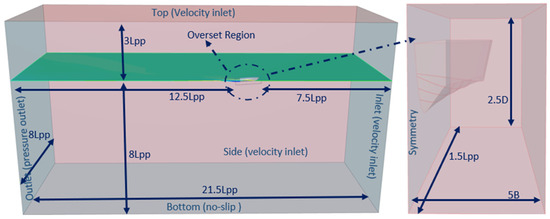 The dimensions of the fluid(s) domain and the overset box, as illustrated in Figure 5, were determined based on key hull parameters: Lpp (length between perpendiculars), D (Depth), and B (Beam). A symmetry boundary approach was adopted, simulating only half of the hull, which significantly reduced the computational costs while maintaining accuracy.
