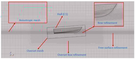 Visualization of the background and overset regions, highlighting the mesh refinements in critical areas of the fluid domain, including the bow, free surface, and overset region, to enhance accuracy and resolution in hydrodynamic simulations.