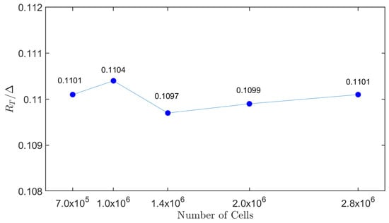 A hybrid meshing approach was adopted, using the trimmer mesh for the background and polyhedral mesh for the overset zone. This strategy reduced the computational time while maintaining the result accuracy, aligning with the best practices outlined by De Luca et al. [35]. After assessing the results, Grid 1 was selected as optimal, as it delivered near-experimental accuracy with minimal computational expense. Table 5 and Figure 7 present the results showcasing minor variations in RT/∆ values across grids, reinforcing this selection.