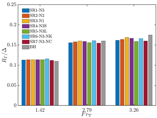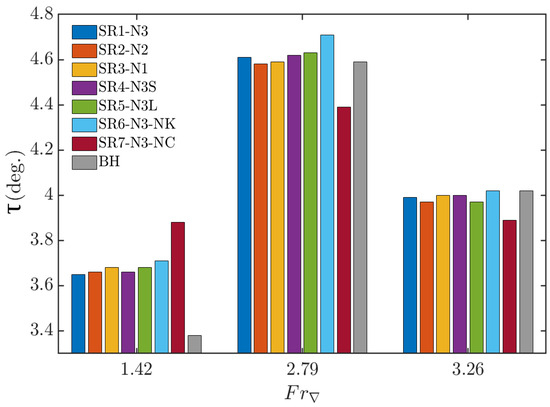 Figure 9 shows the sinkage behavior for all hulls at the three tested speeds. At low speeds, the sinkage values for the modified SR hulls remain similar to those of the base hull (BH). However, as speed increases, the sinkage values for the SR hulls begin to rise and exceed those of the base hull, especially at the highest Froude number. At = 3.26, the base hull exhibits lower sinkage compared to all the modified hulls. This suggests that the SR hulls experience greater vertical displacement, meaning they lift more out of the water as speed increases. This increased lift contributes to the reduction in wetted surface area, which in turn reduces the hydrodynamic resistance. In essence, higher sinkage values correspond to a hull that is more out of the water, benefiting the performance by reducing wetted surface and subsequently resistance.