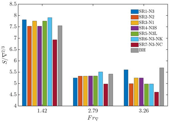 In continuation of the results from Figure 9 (sinkage plot), Figure 10 presents a detailed comparison of the wetted surface area, normalized by the hull’s characteristic volume (), for the various hull configurations. The wetted surface area is a key factor in resistance performance, as a reduction in wetted surface directly leads to decreased resistance.