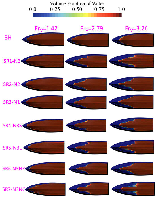 At lower speeds ( = 1.42), the wetted surface remains relatively consistent across all hulls. However, as speed increases, the distinction between hull configurations becomes more pronounced. At = 2.79, the SR6 configuration shows a higher wetted surface than the base hull (BH), implying that its design might be less effective at reducing drag at this speed. Conversely, SR7-N3-NC, which features six spray rails near the chine, demonstrates the most significant reduction in wetted surface across all speeds. By = 3.26, SR7 exhibits the lowest wetted surface, outperforming both the base hull and other spray-rail-modified configurations.