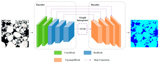 The overall structure of GEFU-Net is shown in Figure 5. It consists of three parts: an encoder, a graph interpreter, and a decoder. The encoder is primarily composed of ConvBlocks and ResBlocks, which facilitate the extraction of deep feature maps from shallow to deep levels. The graph interpreter is the SEGR module, which improves the accuracy of sea ice extraction by enhancing and supplementing semantic information with graph reconstruction of features. The decoder is composed of UpsampleBlocks, which gradually revert the feature to its original size, and the final extraction result is output using a convolution operation with a kernel size of 1 × 1.