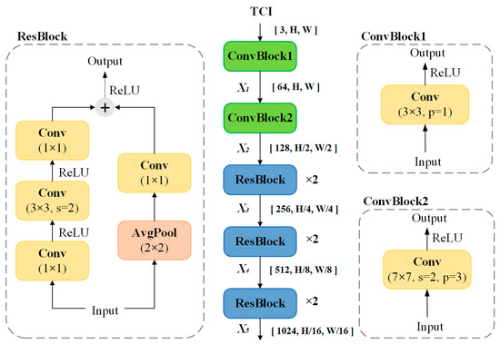 The encoder backbone structure is shown in Figure 6. The ConvBlocks are responsible for extracting shallow features, and primarily consist of convolution operations. ResBlocks are responsible for extracting deep features, inspired by ResNet [33], and consist of a convolution branch and a residual branch. In the convolution branch, the down-sampling operation is performed by 3 × 3 convolution, and the channel alignment operation is performed by 1 × 1 convolution. In the residual branch, to make full use of the original feature information, the 1 × 1 convolution used for down-sampling is replaced by 2 × 2 average pooling, and the 1 × 1 convolution is used solely for channel alignment. Details of the different down-sampling operations are shown in Figure 7. After inputting TCI, the feature can be obtained by the encoder, from shallow to deep layers and from large to small resolutions.