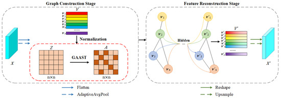 In the feature reconstruction stage, the adjacency matrix A obtained from the above equation contains only information about the adjacency relationships between nodes, while disregarding information about the nodes themselves. Moreover, due to the lack of normalization in the adjacency matrix, the value of similarity between some nodes may become excessively large. Therefore, the following operation is applied to all the provided graphs before graph convolution: