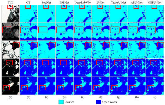 Sea ice extraction results from different models. (a) TCI, (b) ground truth, (c) SegNet, (d) PSPNet, (e) DeepLab, (f) U-Net, (g) TransU-Net, (h) ABU-Net, (i) GEFU-Net.