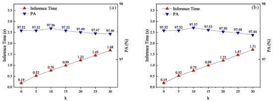 As shown in Figure 11a,b, the left side of the coordinates indicates the inference time for each sample, while the right side indicates the pixel accuracy of the extraction. It is observed that the inference time for both distance metrics increases with k, and an optimal k exists to achieve the best extraction results. Compared with distance metrics, the proposed GAAST does not require manual parameter setting. The dot product operation effectively improves conversion efficiency, allowing the SEGR module to achieve a shorter inference time while maintaining good reconstruction results. Considering that a scene consists of hundreds of samples, the GAAST will significantly enhance the sea ice extraction efficiency of GEFU-Net.