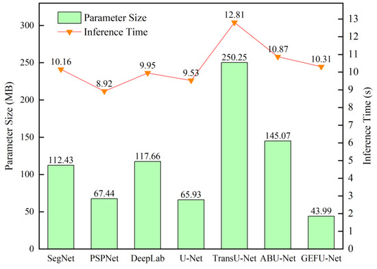 As shown in Figure 14, among several mainstream segmentation models, U-Net not only achieves better sea ice extraction results, but also has fewer model parameters, making it widely used in ice mapping applications [41]. Although TransU-Net and ABU-Net improve the accuracy of the models by improving U-Net, they introduce huge model parameters, which complicates actual deployment. In contrast, the proposed GEFU-Net achieves the best performance with a parameter size of only 43.99 MB, 33.28% smaller than that of U-Net, and an inference time of 10.31 s, only 8.18% longer than that of U-Net. This is due to the use of the GAAST for graph structure conversion in the SEGR module, which effectively enhances conversion efficiency. Additionally, the GCN uses a simple MLP for feature reconstruction, reducing the introduction of additional parameters. Combined with efficient data transfer techniques and model compression methods such as quantization, pruning, and distillation, GEFU-Net offers an effective solution for real-time automated ice mapping.