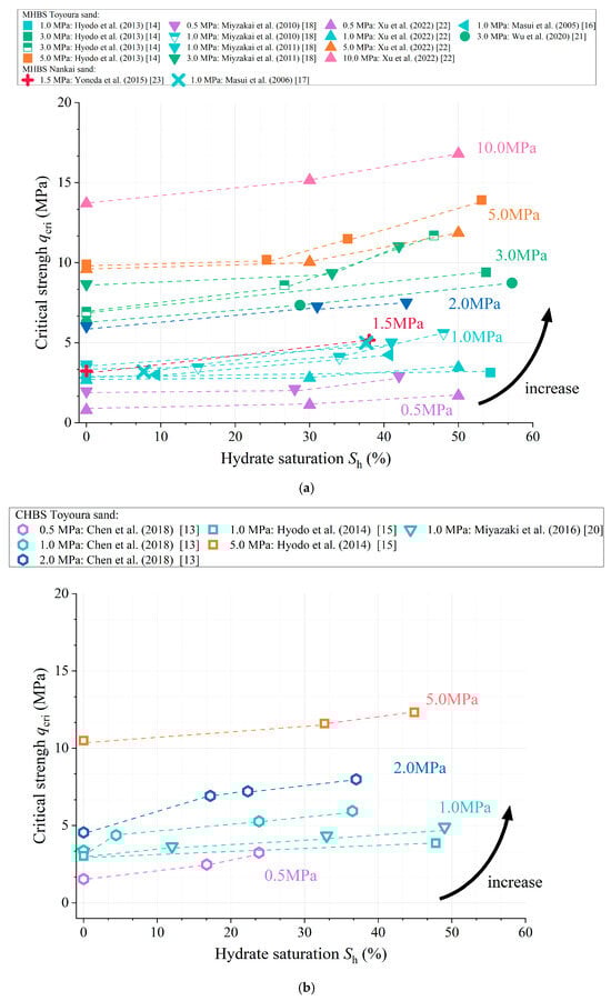 Variations in the critical strength with hydrate saturations and effective confining pressures in GHBSs [,,,,,,,,,]: (a) MHBSs with artificial and natural specimens; (b) CHBSs with artificial specimens.