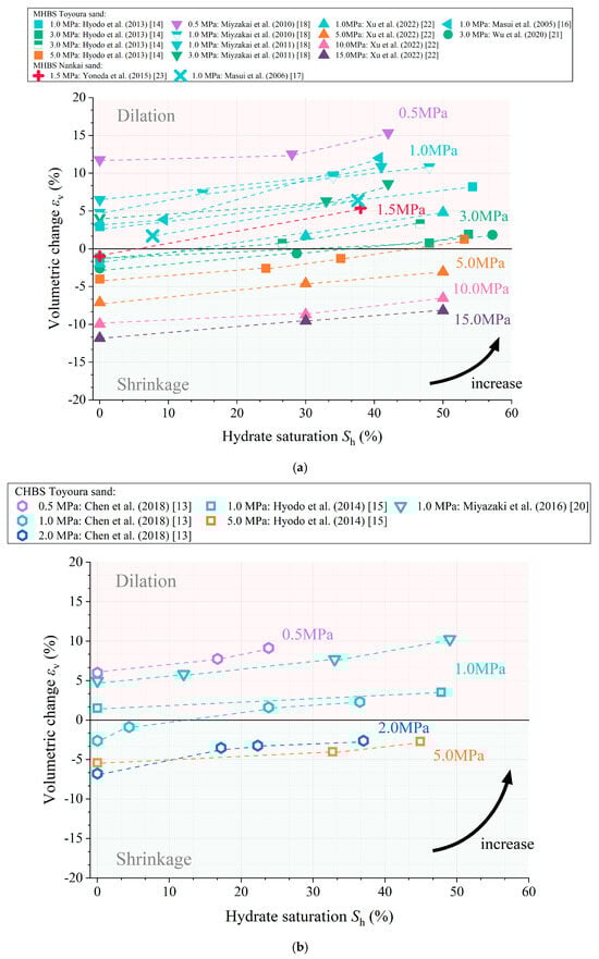Variations in the volumetric change with hydrate saturations and effective confining pressures in GHBSs [,,,,,,,,,]: (a) MHBSs with artificial and natural specimens; (b) CHBSs with artificial specimens.
