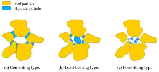 Schematic of main hydrate morphology types in GHBSs: (a) “Cementing” type; (b) “Load-bearing” type; (c) “Pore-filling” type. Modified from Waite et al., 2009 []; Yun et al., 2007 []; and Ta et al., 2015 [].
