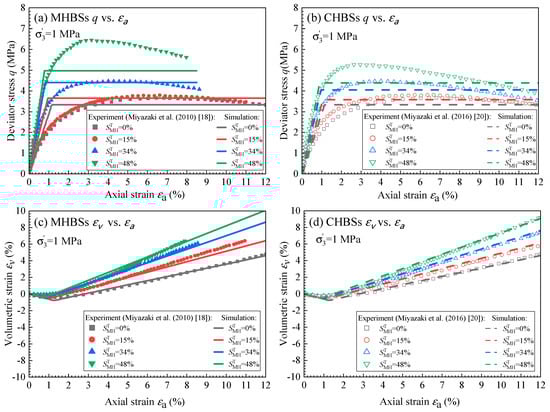 Comparison between the drained triaxial test results and the model predictions for the MHBSs and CHBSs synthesized from Toyoura sand under a 1 MPa effective confining pressure: (a) relationship between the deviator stress q and axial strain of the MHBSs; (b) relationship between the deviator stress q and axial strain of the CHBSs; (c) relationship between the volumetric strain and axial strain of the MHBSs; (d) relationship between the volumetric strain and axial strain of the CHBSs. Test data from Hyodo et al. (2013, 2014) [,].