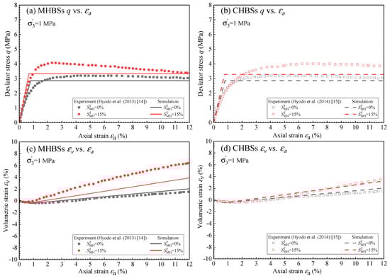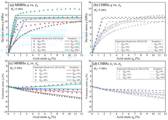 Comparison between the drained triaxial test results and the model predictions for the MHBSs and CHBSs synthesized from Toyoura sand under a 5 MPa effective confining pressure: (a) relationship between the deviator stress q and axial strain of the MHBSs; (b) relationship between the deviator stress q and axial strain of the CHBSs; (c) relationship between the volumetric strain and axial strain of the MHBSs; (d) relationship between the volumetric strain and axial strain of the CHBSs. Test data from Hyodo et al. (2013, 2014) [,].