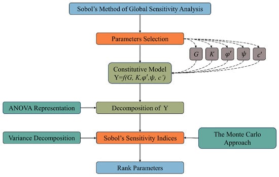 Sobol (1993) [] proposed a global sensitivity analysis method called Sobol’s method that involves decomposing the variance to obtain the Sobol’s sensitivity indexes. This method decomposes the output variances of the model or system into fractions that are regarded as the sum of the variances of the input parameters in increasing dimensionality. The sensitivity indexes of Sobol’s method are used to indicate the contribution of each input factor to the changes in the output, or the contribution from interaction with different factors in the model f(x). A schematic diagram of Sobol’s method is shown in Figure 8. The model parameters serve as input factors to calculate their respective contributions to geomechanical responses.