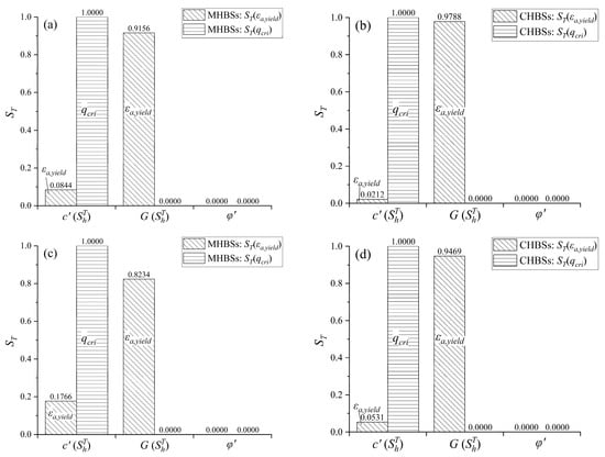 The analysis of the total-order sensitivity index for the soil parameters G, K, , , and revealed distinct geomechanical behaviors in the MHBSs and CHBSs. For the q−response, the total-order sensitivity index of the soil parameters c’, G, and to the critical strength () and the yielding axial strain () are presented in Figure 9. These values correspond to the tests conducted by Miyazaki et al. (2010) [] (Figure 9a), Miyazaki et al. (2016) [] (Figure 9b), Hyodo et al. (2013) [] (Figure 9c), and Hyodo et al. (2014) [] (Figure 9d).