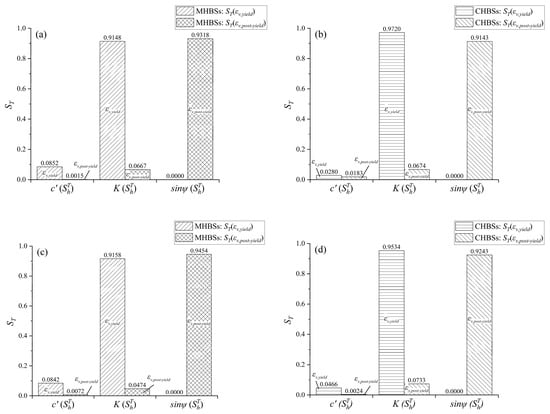 Total-order sensitivity index of c’, K, and sin to and for MHBSs and CHBSs: (a) total-order sensitivity index from MHBS test of Miyazaki et al. (2010) []; (b) total-order sensitivity index from CHBS test of Miyazaki et al. (2016) []; (c) total-order sensitivity index from MHBS test of Hyodo et al. (2013) []; (d) total-order sensitivity index from CHBS test of Hyodo et al. (2014) [].