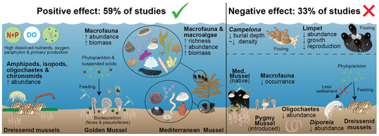In general, the establishment of mussels in high densities had both positive and negative impacts, and these were context- and species-specific. In shallow eutrophic water bodies, impacts were typically considered positive, particularly on benthic communities, through redirecting energy from the water column to the benthos and thus increasing food for benthic invertebrates. Although it was also found that mussels can reduce zooplankton biomass, this is not likely to be an issue in eutrophic water bodies, particularly lakes and estuaries, where zooplankton is typically elevated beyond natural levels. There were also some instances where non-indigenous mussels had negative impacts on native bivalves, and through selective filtering, mussels were also implicated in increasing cyanobacteria concentrations and thus the potential for the release of cyanotoxins. Despite these instances, this review presented multiple lines of evidence that mussel introductions, particularly when undertaken intentionally with suitable species at suitable locations, would have a considerable positive impact on primary and secondary production. The highlighted positive and negative impacts of these mussel invasions on natural aquatic ecosystems thus offer important information for practitioners looking to establish or restore native mussel reefs.